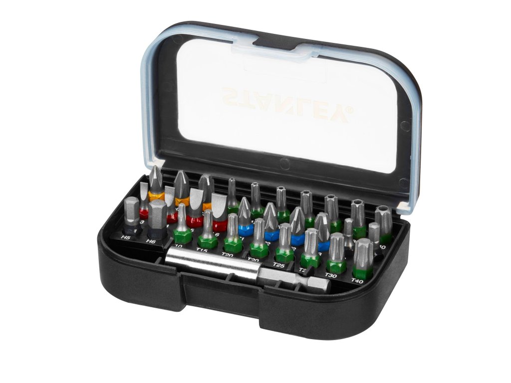 12 sad v predajnom display - PH1-2-3; PZ1; 2x PZ2; PZ3; ploché 3; 4; 5;6 mm; HEX 3-4-5-6; T10-15; 2x T20; T25-27-30-40; TH10-15-20-25-27-30-40; magnetický držiak bitov