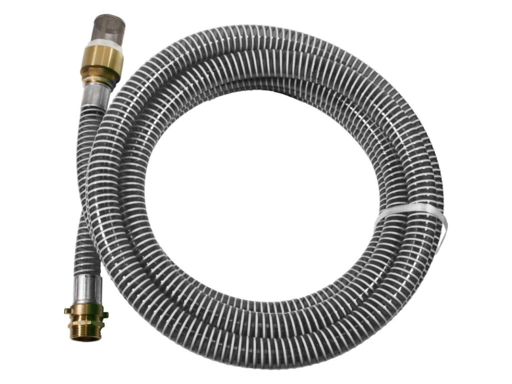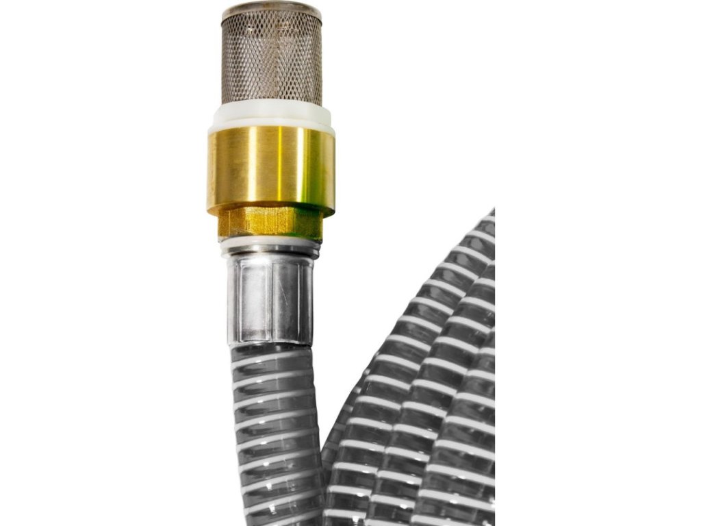 Špirálová sacia garnitúra s mosadznými armatúrami, mosadzným spätným ventilom so sacím košom z ušľachtilej ocele, zalisované koncovky. S prípojkou Vario pre vonkajší a vnútorný závit.