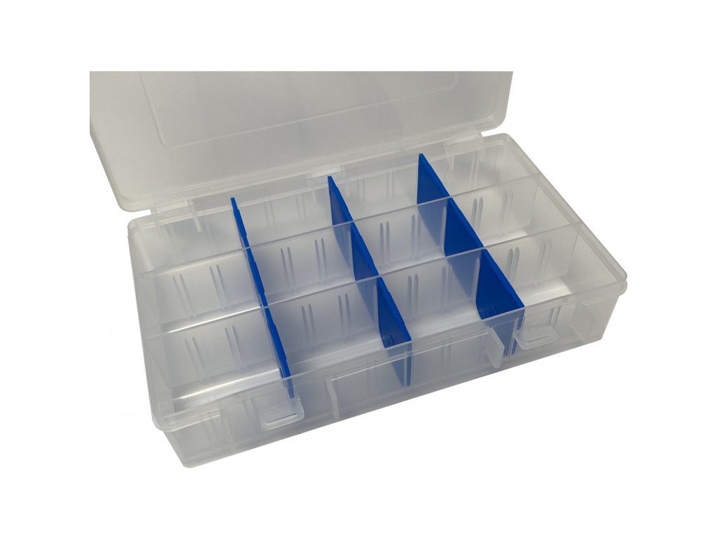 Organizér sa skladá z jedného spodného dielu, jedného veka a dvoch uzáverov, ktoré zabezpečujú jeho pevné a bezpečné zatvorenie. Súčasťou je aj 9 variabilných prepážok, vďaka ktorým je možné vnútorný priestor rozdeliť až na 36 identických políčok. Vnútorný priestor boxu je rozdelený na tri rady s dĺžkou takmer 20,5 cm a šírkou približne 3,7 cm, pričom vnútorná výška krabičky dosahuje približne 4 cm.