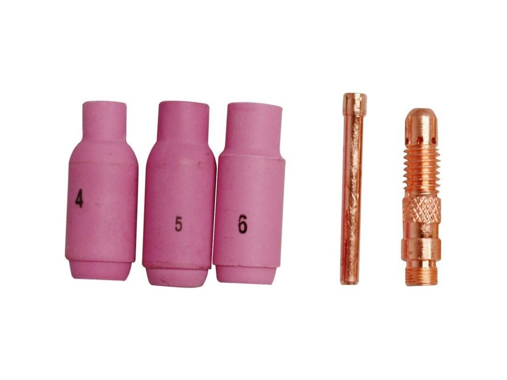 Keramické trysky 4 mm, 5 mm, 6 mm, prúdová tryska 1,6 mm, upínacia klieština 1,6 mm. Vhodné ku Vybaveniu na zváranie WIG (kód tovaru: 41690).
