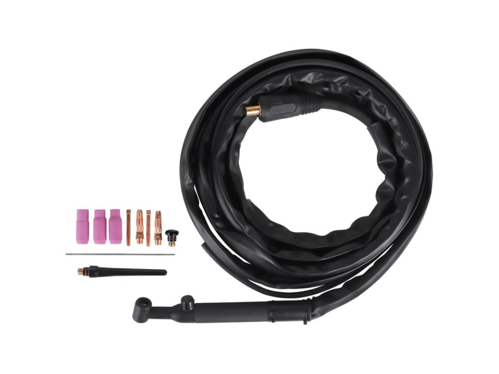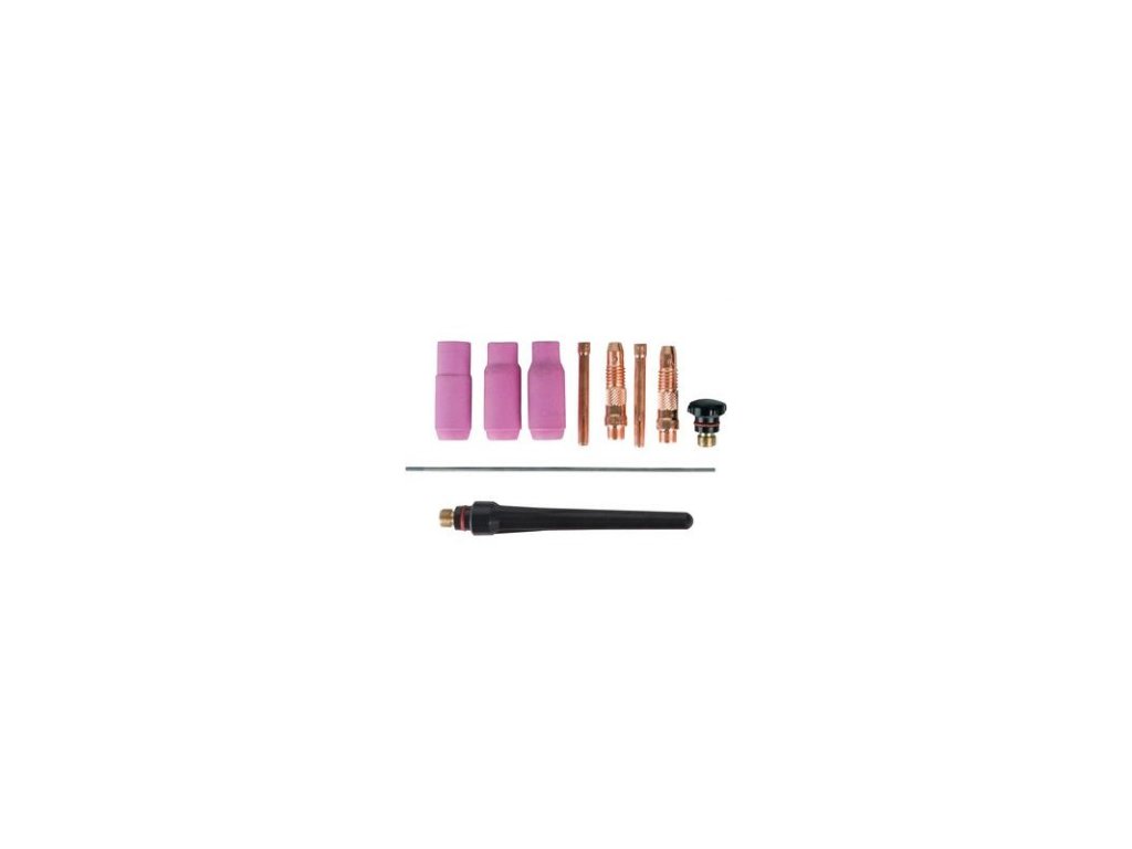 Profesionálna súprava na zváranie metódou TIG obsahuje zvárací horák so 4-metrovým káblom, dlhú a krátku zástrčku, keramické trysky veľkosti 5/6/7, telo ihličkovej svorky (1,6 mm/2,4 mm), volfrámové elektródy (1,6 mm/2,4 mm), prúdovú trysku (1,6 mm/2,4 mm), upínacie klieštiny (1,6 mm/2,4 mm). Vhodné pre Univerzálnu zváračku Uni-Mig 270 SYN AS-Pro (kód tovaru: 20127).