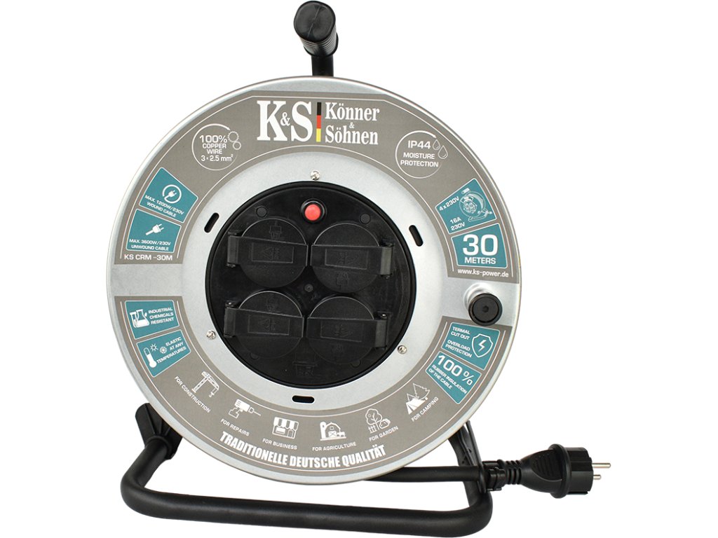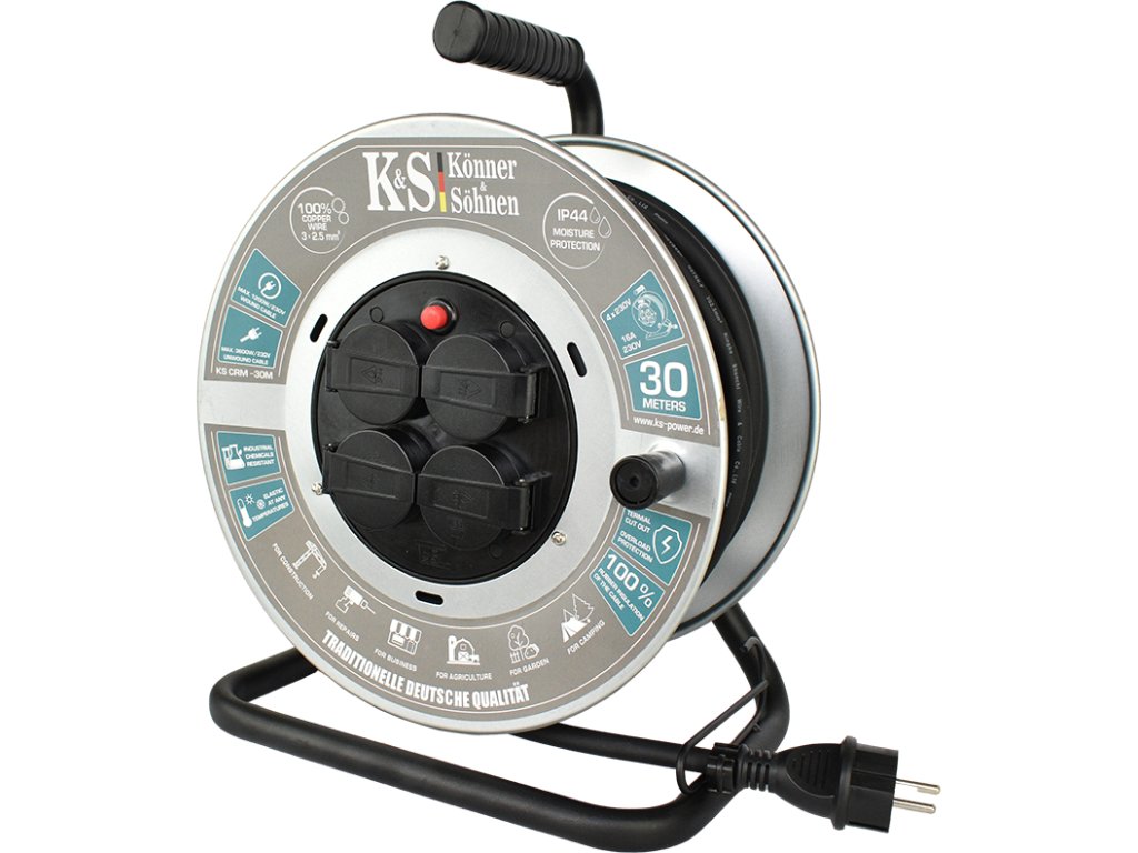 Prodlužovací kabel s navijákem KS CRM-30M a délkou kabelu 30 metrů je vhodný pro připojení až 4 zařízení současně k síti 230V v místech, které jsou daleko od zásuvek. Má třídu ochrany IP44, která umožňuje použití kabelu venku i při vysoké vlhkosti díky ochranným vlastnostem proti náhodnému vniknutí kapiček vody a pevných částic.