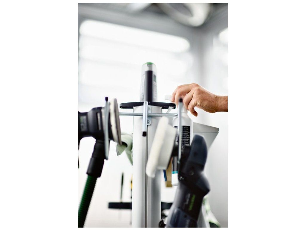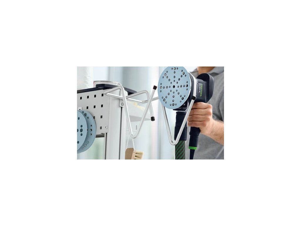 Hák na náradie sa pripevní na pracovné centrum WCR 1000 a bezpečne môže držať dve elektrické alebo pneumatické náradia. To znamená, že môžu byť vždy úhľadne uložené a pripravené kedykoľvek poruke, napríklad počas brúsnych prác. Hák na náradie je ale vhodný aj na uloženie sacej hadice.