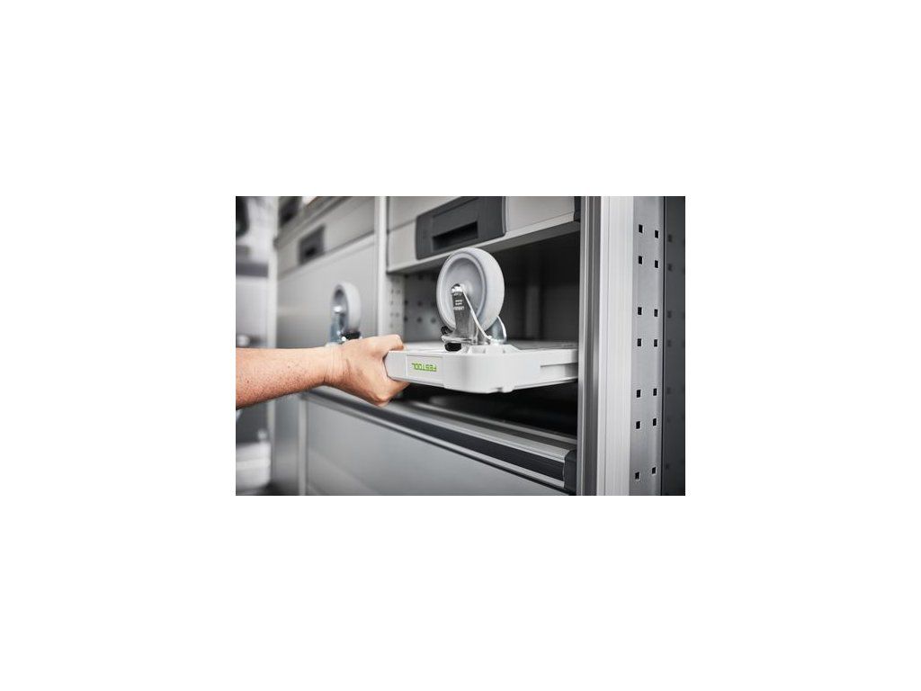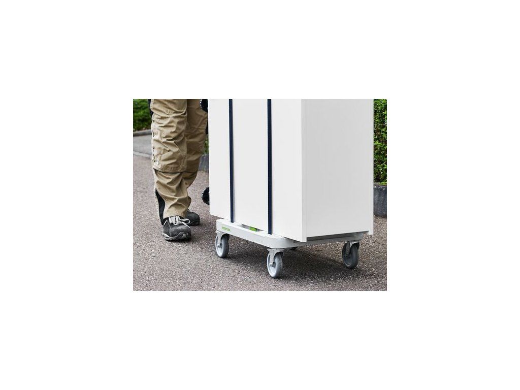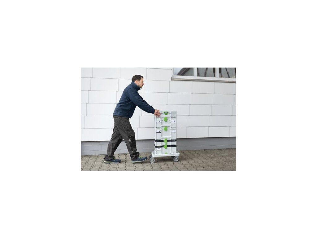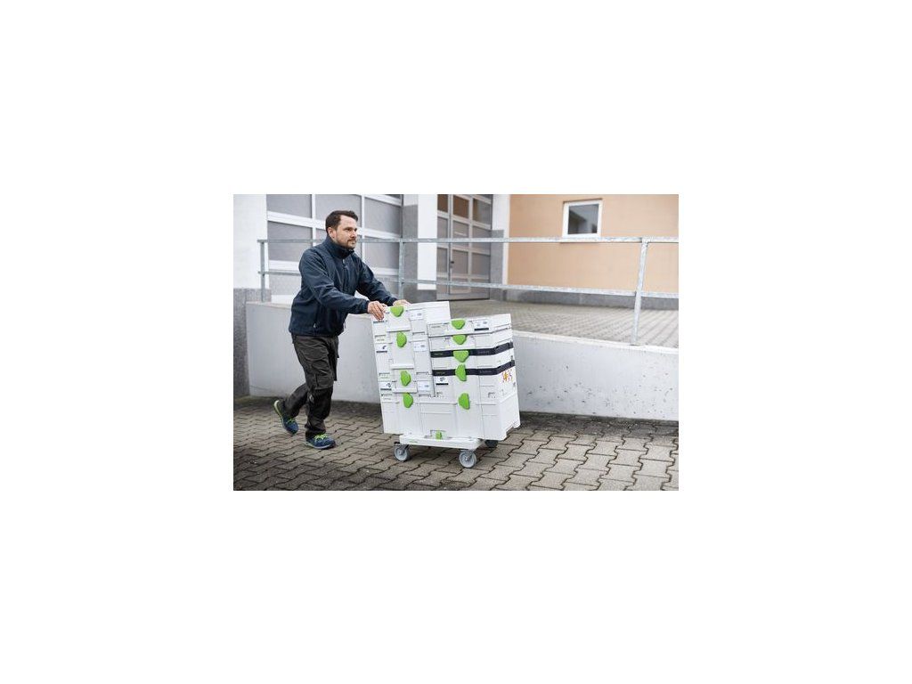 Pojazdný vozík s inteligentnými zvláštnosťami: všetky štyri veľké kolesá možno otáčať o 360°. Vďaka tomu sa pojazdný vozík stáva obratnou pojazdnou podložkou – ideálnou na stavenisko a do dielne. Dve zo štyroch kolies sú vybavené parkovacími brzdami. Systainer³ a Systainer T-LOC možno zafixovať vďaka spojeniu s centrálnym ovládacím prvkom. Iné predmety a materiál možno jednoducho prepravovať vďaka rovnej ploche a zaistiť prostredníctvom ôk na upínací popruh. Štyri robustné rukoväti uľahčujú manévrovanie a polohovanie pojazdného vozíka.