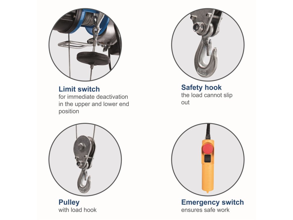 Tento kompaktní lanový naviják je určený ke zvedání a spouštění břemen do hmotnosti až 250 kg. Výborně poslouží jako obslužné zdvihadlo pro montážní a údržbářské práce v dílnách, garážích nebo řemeslných provozech. Výhodou je snadná údržba i obsluha. Celá konstrukce je z velmi kvalitních materiálů, obsahuje veškeré důležité bezpečnostní prvky, je poměrně lehká a snadno přemístitelná. Obslužný spínač s nouzovým vypínáním má dlouhý přívodní kabel, břemenový hák má bezpečnostní pojistku, motor je vybaven termospínačem, automatickým přerušovačem odvíjení a automatickou brzdou. Speciální upevňovací spony jsou součástí dodávky. Kontaktní údaje výrobce / dovozce / zplnomocněného zástupce výrobce v EU: Scheppach GmbH Günzburger Str. 69, 89335 Ichenhausen, Germany email: service@scheppach.comDodatočné parametre