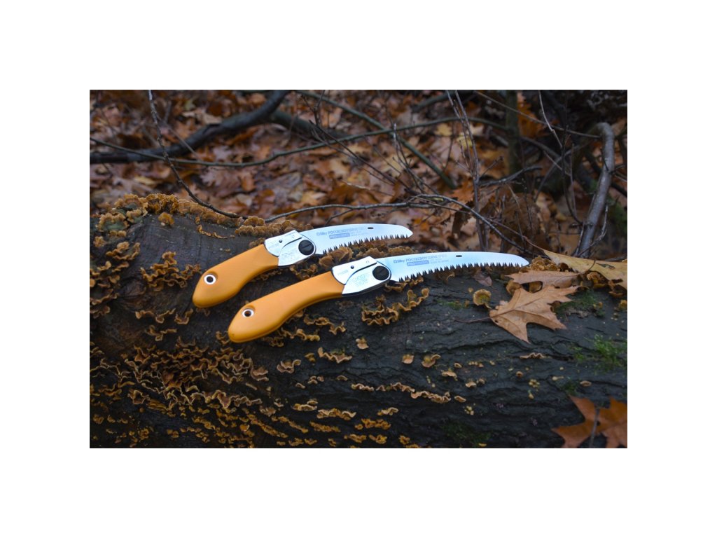 Pocketboy Curve 130-8 Jedná se o extrémně kompaktní lehkou skládací pilku s velmi agresivním zahnutým pilovým listem, která zabírá velmi málo místa ve vaší kapse či batohu. Tato multifunkční prořezávací pila je ideální pro všechny druhy prořezávacích činností na Vaší zahradě. Nenechte se však zmást velikostí Pocketboye. Tato malá pila poskytuje skvělý výkon! A protože se Pocketboy snadno vejde do kapsy či batohu, můžete mít tuto pilu vždy po ruce. Součástí balení je navíc i průhledné plastové flip-lock pouzdro s klipem na opasek. Vlastnosti Pevný 130 mm pilový list s prořezem 1,4 mm je plně odolný proti venkovním podmínkám. Čepel je osazena velmi agresivními zuby ostrými jako břitva, díky kterým nebudete mít problém přeříznout během okamžiku i větve o průměru až 6 cm. Díky zakřivenému ostří je pila vhodná pro řezání nad úrovní ramen nebo naopak nízko v prostoru pod koleny, jelikož tvar ostří udržuje pilu stále pevně v řezu. Pilu lze jednoduše složit a rozložit pomocí aretačního tlačítka, které zároveň dovoluje uživateli nastavit 2 různé polohy řezání. Gumová rukojeť pak tlumí vibrace a zajišťuje bezpečný a pohodlný úchop. Pro větší praktičnost je v rukojeti přítomen otvor, který umožňuje k pile připevnit karabinu nebo lano. Při plném složení se ostří pily bezpečně schová do rukojeti. Nemusíte se tak bát, že byste se zranili nebo pilku otupily. Série Pocketboy 130 Série skládacích pil Pocketboy 130 představuje sérii kompaktních pilek s velkým řezným výkonem. Tyto malé lehké pomocníky oceníce nejen na svých cestách divočinou, ale i na zahradě při prořezávání stromků s husotu korunou. Firma Silky moc dobře ví, že různé situace vyžadují různé způsoby řešení a tak jsou pily série Pocketboy dodávány ve čtyřech barevně rozlišených provedeních: Žlutá - Pocketboy Curve 130-8 ( zahnutá čepel; velmi agresivní záběr; 8 zubů na 30 mm ) Červená - Pocketboy 130-8 ( rovná čepel; velmi agresivní záběr; 8 zubů na 30 mm ) Černá - Pocketboy 130-10 ( rovná čepel; středně agresivní záběr; 10 zubů na 30 mm ) Modrá - Pocketboy 130-20 ( rovná čepel; velmi jemný záběr; 20 zubů na 30 mm ) Všechny čepele jsou však mezi pilami navzájem vyměnitelné. Je tak možné si dokoupit pouze samotnou čepel, plochým šroubovákem povolit hlavní pojistý šroub a nakonfigurovat si pilu pro aktuální typ použití. Údržba pily Pro zachování účinnosti je nutné udržovat čepel v čistotě. Pokud je tedy ostří zalepeno pryskyřicí, či mízou, použijte k čištění olivový olej. Jedná se o účinný a ekologický způsob, jak rozpustit tyto nečisoty. Pokud pilu déle nepoužíváte, dbejte na to, aby byla vždy suchá.Dodatočné parametre
