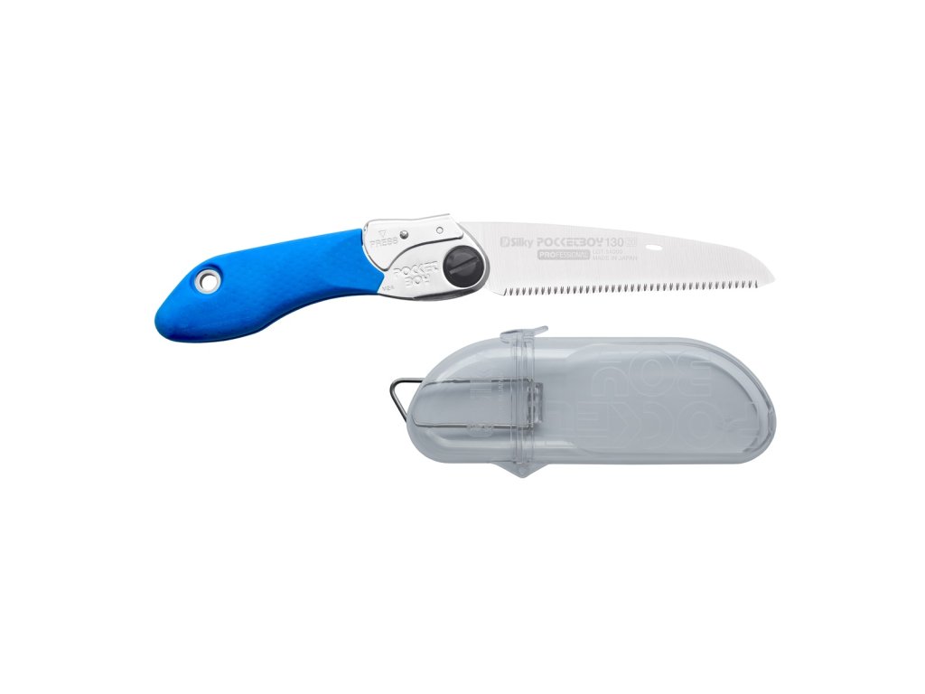 Pocketboy 130-20 Jedná se o extrémně kompaktní lehkou skládací pilku s jemným pilovým listem, která zabírá velmi málo místa ve vaší kapse či batohu. Pilku však určitě využijete i u sebe na zahradě a to hlavně v případě, kdy potřebujete například prožezat stromky s hustou korunou a nepoškodit ostatní rostlinou tkáň. Součástí balení je navíc i průhledné plastové flip-lock pouzdro s klipem na opasek. Vlastnosti Pevný 130 mm pilový list s prořezem 0,9 mm je plně odolný proti venkovním podmínkám. Čepel je osazena extra jemnými zuby ostrými jako břitva, díky kterým nebudete mít problém přeříznout i větve o průměru až 6 cm. Tento model navíc zanechává kvůli většímu počtu menších zubů hladší řezy. Pilu lze jednoduše složit a rozložit pomocí aretačního tlačítka, které zároveň dovoluje uživateli nastavit 2 různé polohy řezání. Gumová rukojeť pak tlumí vibrace a zajišťuje bezpečný a pohodlný úchop. Pro větší praktičnost je v rukojeti přítomen otvor, který umožňuje k pile připevnit karabinu nebo lano. Při plném složení se ostří pily bezpečně schová do rukojeti. Nemusíte se tak bát, že byste se zranili nebo pilku otupily. Série Pocketboy 130 Série skládacích pil Pocketboy 130 představuje sérii kompaktních pilek s velkým řezným výkonem. Tyto malé lehké pomocníky oceníce nejen na svých cestách divočinou, ale i na zahradě při prořezávání stromků s husotu korunou. Firma Silky moc dobře ví, že různé situace vyžadují různé způsoby řešení a tak jsou pily série Pocketboy dodávány ve čtyřech barevně rozlišených provedeních: Žlutá - Pocketboy Curve 130-8 ( zahnutá čepel; velmi agresivní záběr; 8 zubů na 30 mm ) Červená - Pocketboy 130-8 ( rovná čepel; velmi agresivní záběr; 8 zubů na 30 mm ) Černá - Pocketboy 130-10 ( rovná čepel; středně agresivní záběr; 10 zubů na 30 mm ) Modrá - Pocketboy 130-20 ( rovná čepel; velmi jemný záběr; 20 zubů na 30 mm ) Všechny čepele jsou však mezi pilami navzájem vyměnitelné. Je tak možné si dokoupit pouze samotnou čepel, plochým šroubovákem povolit hlavní pojistý šroub a nakonfigurovat si pilu pro aktuální typ použití. Údržba pily Pro zachování účinnosti je nutné udržovat čepel v čistotě. Pokud je tedy ostří zalepeno pryskyřicí, či mízou, použijte k čištění olivový olej. Jedná se o účinný a ekologický způsob, jak rozpustit tyto nečisoty. Pokud pilu déle nepoužíváte, dbejte na to, aby byla vždy suchá.Dodatočné parametre
