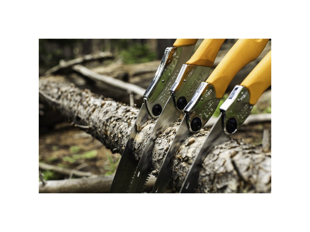 Gomboy Curve je přepracovaná verze klasické skládací pily Gomboy, která byla vybavena zahnutou čepelí pro větší řeznou sílu, zejména při řezání ve stromě. Díky lehké konstrukci s ocelovou rukojetí je pila Gomboy Curve neuvěřitelně odolná a všestranně použitelná v každodenních pracovních podmínkách nebo při projektech kolem domu. Čepel dlouhá 270 mm je osazena velkými zuby v počtu 8 na 3 cm, které si snadno poradí s čerstvým i suchým dřevo. Zmíněný zakřivený tvar čepele celkově zvyšuje agresivitu, se kterou zuby prořezávají dřevo, a navíc se s pilou dobře pracuje i v extrémnějších polohách, například při řezání nad úrovní ramen. Pohodlný úchop nástroje zajišťuje krásně žlutá pryžová rukojeť, která absorbuje vibrace a neklouže ani za mokra. Otvor v rukojeti pak umožňuje připevnění lanka nebo karabiny. Při složení pily jsou zuby dokonale chráněny před vnějšími mechanickým vlivy a zároveň nepoškozují okolní věci, takže lze pilku v klidu sbalit do batohu na vícedenní výlet. Pro zachování účinnosti je nutné udržovat čepel v čistotě. Pokud je tedy ostří zalepeno pryskyřicí, či mízou, použijte k čištění olivový olej. Jedná se o účinný a ekologický způsob, jak rozpustit tyto nečisoty. Pokud pilu déle nepoužíváte, dbejte na to, aby byla vždy suchá. Případné bezpečnostní pokyny, výstrahy a upozornění jsou součástí návodu k obsluze. Kontaktní údaje výrobce / dovozce / zplnomocněného zástupce výrobce v EU: De Wild B.V. Spectrum 38, 4706 NM Roosendaal, Netherlands email: support@silky-europe.comDodatočné parametre