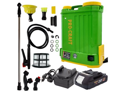 AKU postrekovač Procraft AS20-12 sada s 20V 2Ah batériou a nabíjačkou Max. prietok tryskou: 3,1 l/min Tlak: 1,5-5 bar Kovová teleskopická tyč 47-84 cm PVC hadica 1,1 m Objem 12...