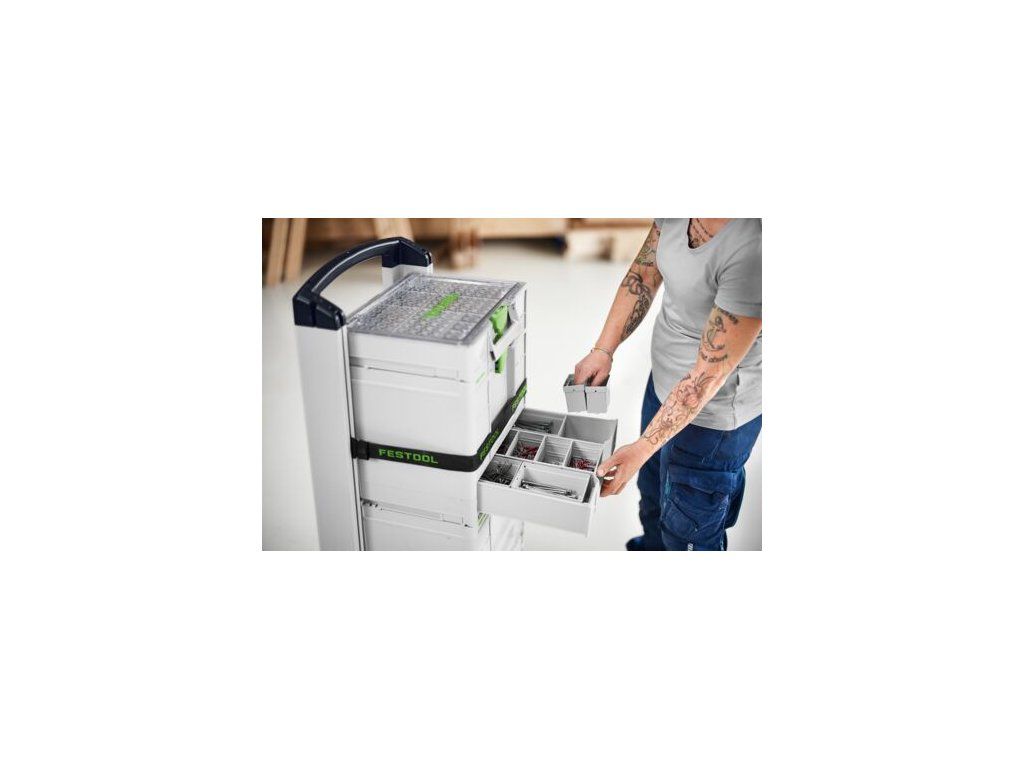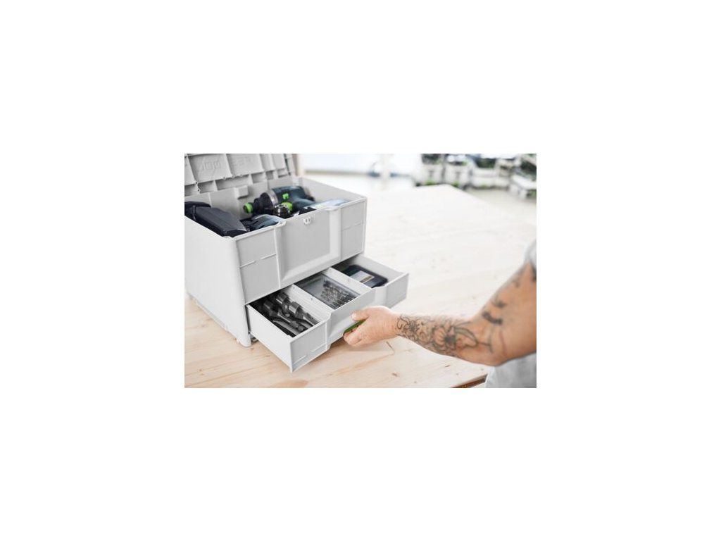 Chytrá kombinácia Systainer³ a Sortainer³: v kontajneri Systainer³ Combi môžete prenášať vaše náradie a príslušenstvo spolu v jednom kontajneri Systainer. Hore máte miesto na bezpečné uskladnenie počas prepravy elektrického a ručného náradia; dola nájde svoje miesto vhodné príslušenstvo. Zásuvky si môžete individuálne rozdeliť pomocou priečok alebo samostatne dostupných vkladacích boxov – máte tak drobné diely, ako klince, kolíky alebo skrutky vždy prehľadne usporiadané. Všetko máte poruke – čo poskytuje väčší poriadok a úsporu času na pracovisku.