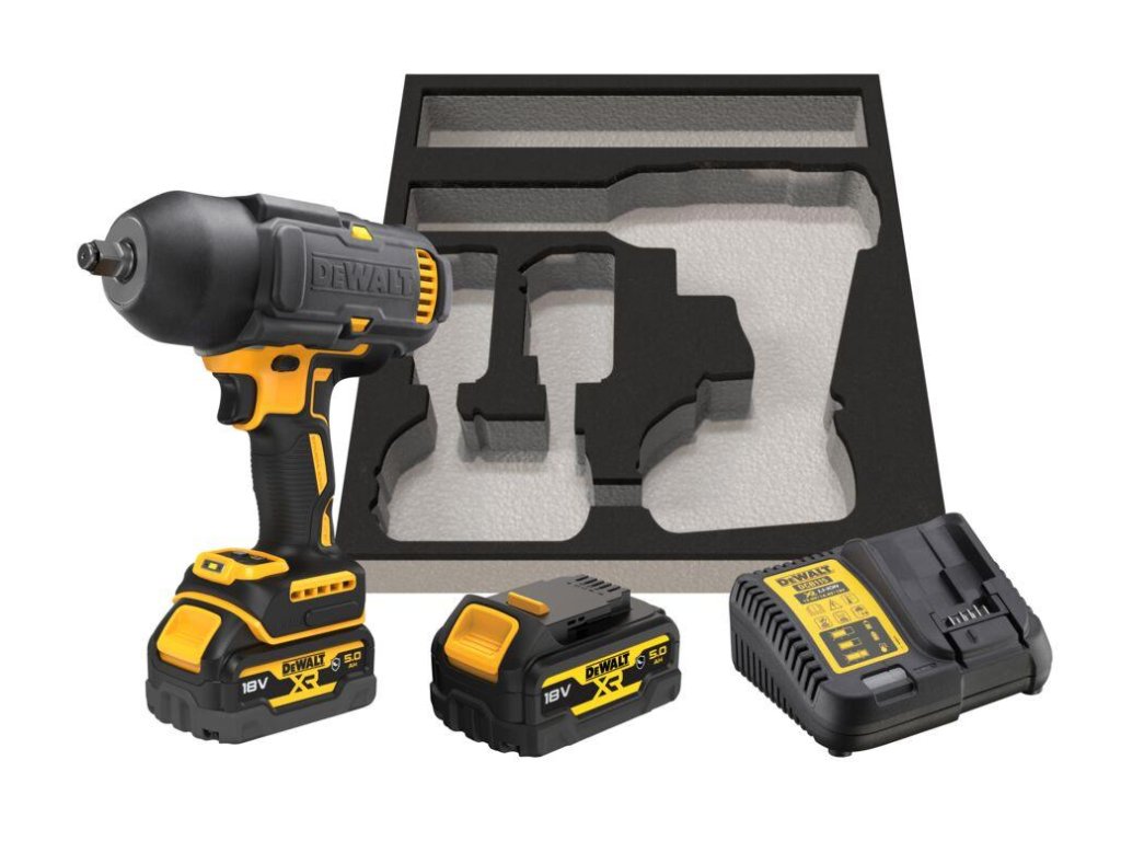 - DCF900P2G: 2× akumulátor DCB184G s GFN krytom, s ochranným krytom tela náradia a tvarovanou PUR vložkou na uloženie do montážneho vozíka.