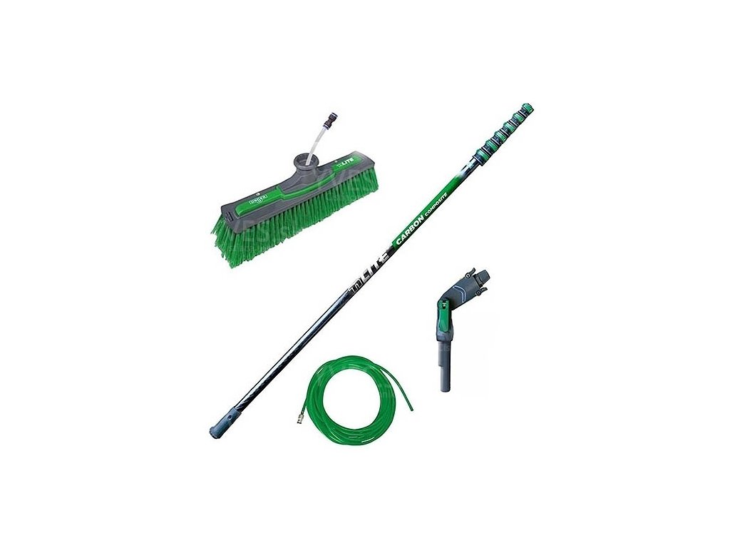 UNGER nLite KIT teleskop Carbon Composite na čistenie malých až stredných výšok vrátane kefy, súpravy uhlového adaptéra a hadice. Teleskop je vyrobený z kvalitnej zmesi uhlíkových a sklenených vlákien a je ideálny na čistenie až do výšky 2. poschodia. Súčasťou tohto kitu je aj čistiaca kefa nLite so šírkou 28 cm a integrovanými tryskami pre jednoduché odstraňovanie nečistôt. Kit tiež obsahuje aj sadu uhlového adaptéra veľkosti S a hadicu DuroFlex s dĺžkou 25 m.