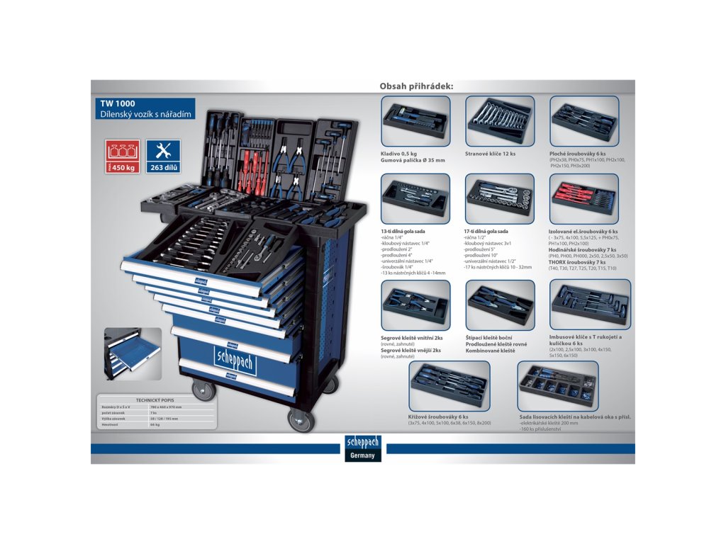 Scheppach TW 1000 je profesionální celokovový dílenský vozík vhodný do domácích i řemeslných dílen, garáží, servisů apod. Vyznačuje se velmi tuhou konstrukcí, opláštěním hran vozíku tvrzeným plastem, pracovní deskou z odolného plastu s prolisy pro uložení drobného materiálu a s nízkým ochranným lemem, který udrží vaše nářadí vždy na místě. Pro snadnou manipulaci s vozíkem slouží dvě transportní měkčená madla a čtyři velká kola. Ty jsou pogumovaná a jedno z nich je plně otočné s integrovanou brzdou. Špičkovou kvalitu poznáte i podle snadné manipulace se zásuvkami. Ty jsou vybaveny velmi robustními a kvalitními pojezdy, takže se s nimi snadno manipuluje i při plném zatížení. Samozřejmostí je mechanismus bránící jejich samovolnému otevření a rovněž zámek, který chrání obsah před přístupem nepovolaných osob. Boční stěny vozíku jsou vybaveny děrovanou deskou, na kterou lze navěsit další nářadí nebo vhodné držáky či poličky. Čtyři zásuvky jsou vybaveny kvalitním běžně používaným nářadím (gola sady, kleště, různé druhy šroubováků, kladiva, klíče, elektrikářské díly apod.), zbylé tři zásuvky si můžete dovybavit nářadím dle svých požadavků. Každý kus nářadí má přesně stanovené místo a bude tak vždy a rychle po ruce. Obsah přihrádek: 1. Kladivo 0,5 kg Gumová palička O 35 mm 2. Stranové klíče 12 ks 3. Ploché šroubováky 6 ks (PH2x38, PH0x75, PH1x100, PH2x100, PH2x150, PH3x200) 4. Segrové kleště vnitřní 2ks (rovné, zahnuté) Segrové kleště vnější 2ks (rovné, zahnuté) 5. Štípací kleště boční Prodloužené kleště rovné Kombinované kleště 6. 17-ti dílná gola sada -ráčna 1/2" -kloubový nástavec 3v1 -prodloužení 5" -prodloužení 10" -univerzální nástavec 1/2" -17 ks nástrčných klíčů 10"-32" 7. 13-ti dílná gola sada -ráčna 1/4" -kloubový nástavec 1/4" -prodloužení 2" -prodloužení 4" -univerzální nástavec 1/4" -šroubovák 1/4" -13 ks nástrčných klíčů 4"-14" 8. Izolované elektrikářské šroubováky 6 ks ( - 3x75, 4x100, 5,5x125, + PH0x75, PH1x100, PH2x100) Hodinářské šroubováky 7 ks (PH0, PH00, PH000, 2x50, 2,5x50, 3x50) THORX šroubováky 7 ks (T40, T30, T27, T25, T20, T15, T10) 9. Imbusové klíče s T rukojetí a kuličkou 6 ks (2x100, 2,5x100, 3x100, 4x150, 5x150, 6x150) 10. Křížové šroubováky 6 ks (3x75, 4x100, 5x100, 6x38, 6x150, 8x200) 11. Sada lisovacích kleští na kabelová oka s příslušenstvím -elektrikářské kleště 200 mm -160 ks příslušenství Kontaktní údaje výrobce / dovozce / zplnomocněného zástupce výrobce v EU: Scheppach GmbH Günzburger Str. 69, 89335 Ichenhausen, Germany email: service@scheppach.comDodatočné parametre