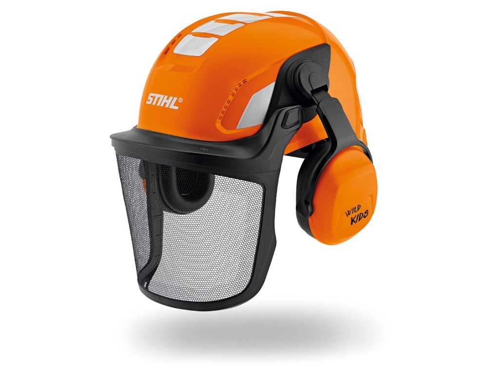 Verná napodobenina originálnej profesionálnej prilby STIHL, plast ABS, sklopný štít, nastaviteľná veľkosť, sklopná ochrana uší, bez ochrannej funkcie, vhodná pre deti od 3 rokov.