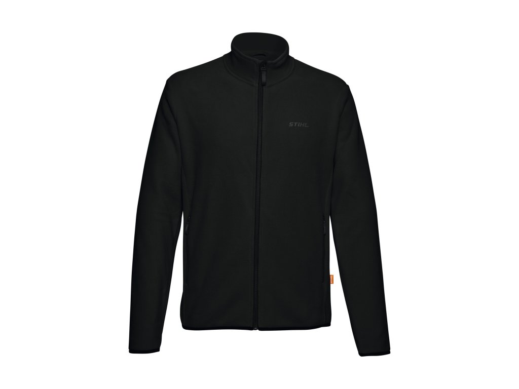 Čierna flisová bunda na zips, materiál: 100% polyester. Stojatý golier, dve bočné vrecká na zips, elastické oranžové lemovanie.