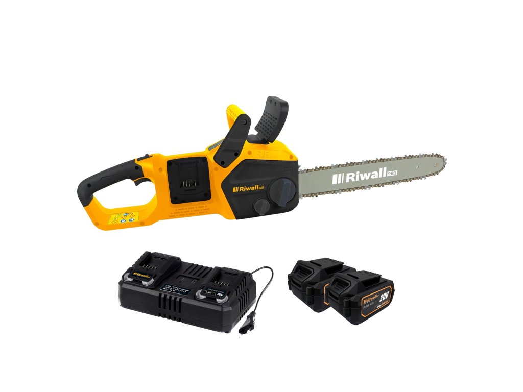 aku reťazová píla 40 V (2 x 20 V) + 2x 4 Ah batéria + duálna rýchlonabíjačka 4,5 A Riwall PRO RACS 4020i SET