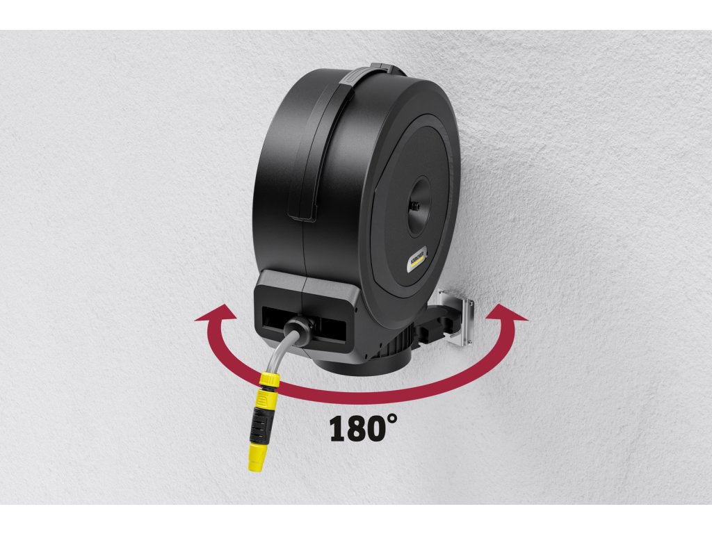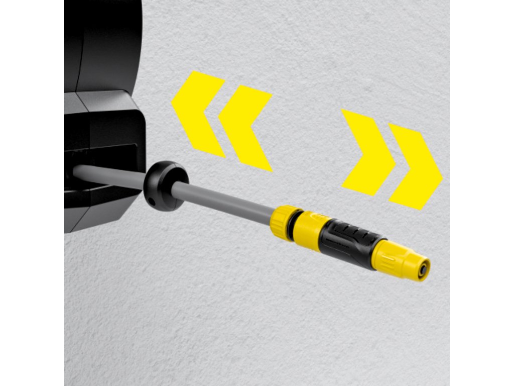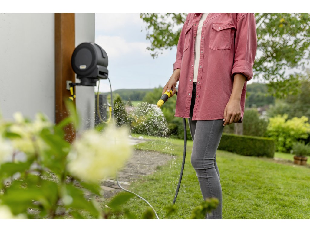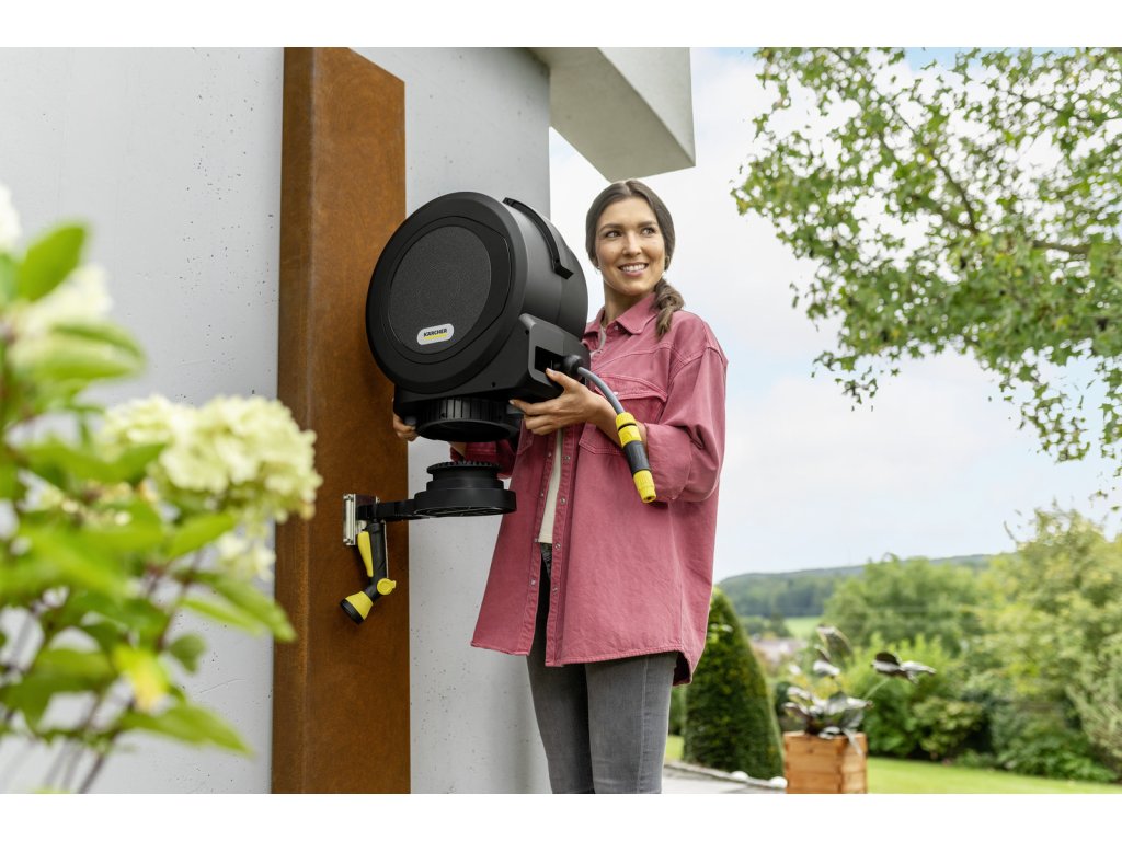 Záhradnú hadicu je možné ľahko predĺžiť na maximálnu dĺžku 15 metrov. Hadica sa v krátkych intervaloch zapína úplne automaticky. Jemným potiahnutím za koniec hadice sa uvoľní zaisťovací mechanizmus, takže hadica sa automaticky a kontrolovane zasunie bez zalomenia alebo uzlov. Vďaka inovatívnemu systému FlexChange je možné box na hadicu vybrať z nástenného držiaka bez potreby náradia, čo je ideálne na uloženie v zime. Box je odolný voči UV žiareniu a mrazu a Kärcher na výrobok ponúka päťročnú záruku. Na ochranu pred krádežou je možné pripevniť káblový zámok.