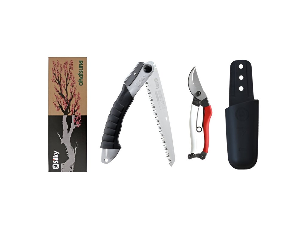 Sada na prořezávání Okatsune 103 & Silky Super Accel Dva japonské bestsellery, s pouzdrem zdarma, v luxusní dárkové krabičce. Pořiďte sobě nebo svému nejlepšímu zahradnímu příteli tuto krásnou sadu na prořezávání. Pro stříhání tenkých slouží osvědčené zahradnické nůžky Okatsune 103, silnější větve lze pak snadno zakrátit pomocí skládací pily Super Accel od společnosti Silky, která je ostrá jako břitva a zanechá hladký řez. Díky speciálně navrženému pouzdru budete mít navíc všechny nástroje ihned po ruce. S touto sadou zvládnete opravdu všechny prořezávací práce na zahradě! Okatsune 103 – zahradní nůžky pro středně velké ruce Model Okatsune 103 je kompaktní typ profesionálních jednočepelových zahradních nůžek (tzv. bypass/secateurs), které jsou svojí velikostí ideální pro uživatele se středně velkýma rukama. Díky dvěma prohnutým protichůdným 55 mm čepelím dosahují nůžky hladkého a čistého řezu bez poškození okolní rostlinné tkáně. Tyto zahradní nůžky se využívají především ke stříhání měkkého rostlinného materiálu a čerstvého dřeva do průměru až 25 mm. Ergonomická rukojeť a jednoduchý funkční zámek, který lze ovládat jednou rukou, či případně sklopit dovnitř během používání, zajišťují pohodlné a bezpečné ovládání nástroje. Kombinace nízké hmotnosti, pevnosti a snadné údržby dělá z těchto nůžek oblíbený nástroj i profesionálních Japonských zahradníků. Osvědčená japonská technologie Čepel nůžek Okatsune je vyrobena z výjimečně kvalitní japonské oceli Izumo Yasugi, která je proslulá vysokým obsahem uhlíku. Pomocí unikátní technologie kalení a temperování dosahuje tvrdosti 60–61 HRC podle Rockwellovy stupnice, což je úroveň srovnatelná se samurajskými meči. Díky tomu si čepel dlouho zachovává ostrost, vyžaduje jen minimální údržbu a při střihu vynakládáte minimum energie. Kromě tvrdosti se materiál vyznačuje i speciální pružností – čepele tak po každém střihu zůstávají perfektně vyrovnané, i při dlouhodobém používání. Dvojité úhly broušení zajišťují hladký střih bez drcení dřeva a minimální poškození rostlin. Všechny součásti jsou pak sestaveny tak, aby byly nůžky maximálně funkční, jednoduché a zároveň dlouhodobě spolehlivé. Rukojeti nůžek již tradičně nesou v nádechu červené a bílé barvy. Tato kombinace je nejen snadno rozpoznatelná na zahradě, ale v Japonsku, zemi vycházejícího slunce, také symbolizuje „štěstí“. Silky Super Accel 210-7.5 Super Accel je lehká (208 g), ale velmi odolná japonská tahová pilka, kterou si oblíbilo nespočet zahradníků po celém světě. Díky praktickému skládacímu provedení ji snadno uložíte do kapsy, brašny nebo nářadí na opasku. Pokud nemáte se Silky pilami zkušenost, buďte připraveni – jejich zuby jsou extrémně ostré a řežou velmi rychle. I po opakovaném používání zůstávají zuby ostré a zanechávají čisté řezy, díky čemuž se obnažené plochy dřevin lépe a rychleji hojí. Lehká a přitom odolná konstrukce Super Accel je vybaven unikátní 21 cm kalenou čepelí se zuby Silky Mirai-Me s hustotou osazení 7,5 zubů na 3 cm. Pilka se proto doslova zakousne do dřeva a drží pevně v řezu. Je tedy skvělým pomocníkem i při řezání ve výšce nad rameny nebo naopak nízko, v prostoru pod koleny. Pilku lze jednoduše složit a rozložit pomocí aretačního tlačítka, přičemž jsou dostupné dvě různé polohy řezání. S pomocí zářezu v čepeli jednoduše odklopit i v rukavicích. Rukojeť z odolného hliníku je potažena pryžovým materiálem, který absorbuje vibrace a zajišťuje jistý úchop za všech podmínek. V zadní části se pak nachází i otvor, který usnadňuje připevnění lanka nebo karabiny. Při složení pilky rukojeť dokonale chrání čepel před poškozením.Dodatočné parametre