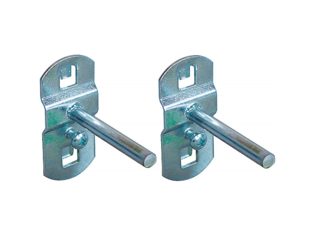 Držiak dielenského náradia a nástrojov na uchytenie do perforovanej steny a systémov so štvorcovými otvormi 8x8 - 10x10 mm, stredovou vzdialenosťou otvorov 38 mm vertikálne a horizontálne. Rovné zakončenie háčika, hĺbka 50 mm. V balení 2 ks.