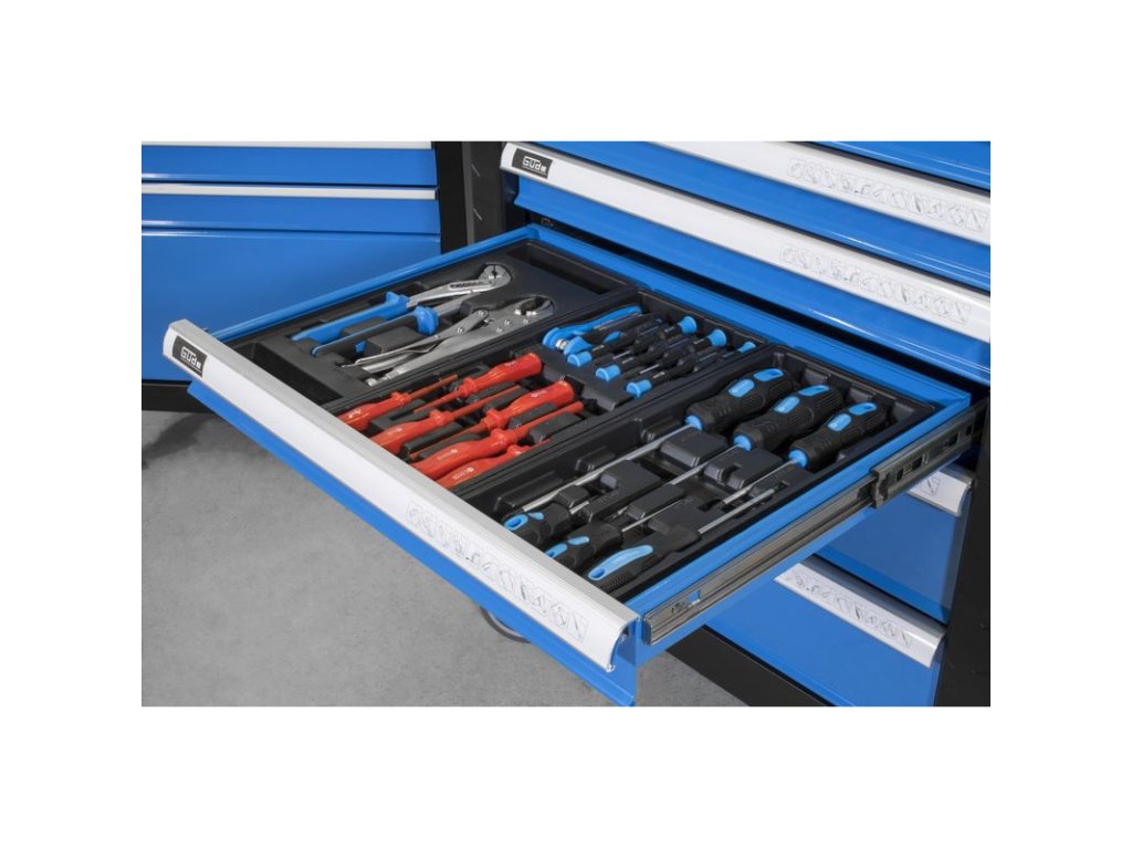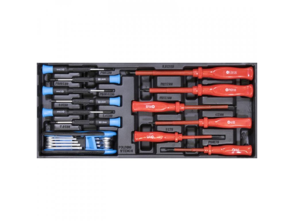 Izolované skrutkovače ploché 3*75, 4*100, 5*125 mm, izolované skrutkovače krížové 0*75, 1*100, 2*100 mm, viaczubé kľúče, skrutkovače na jemnú mechaniku krížové 0,1,2 / ploché 1,2,3, v plastovej vložke do zásuvky.