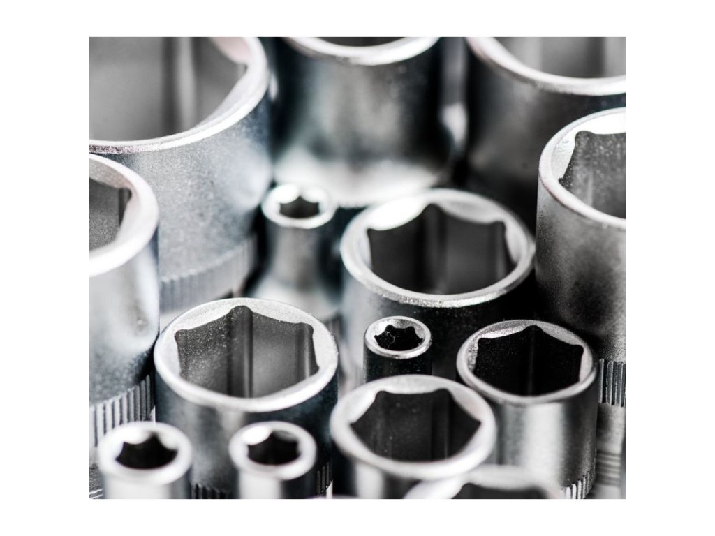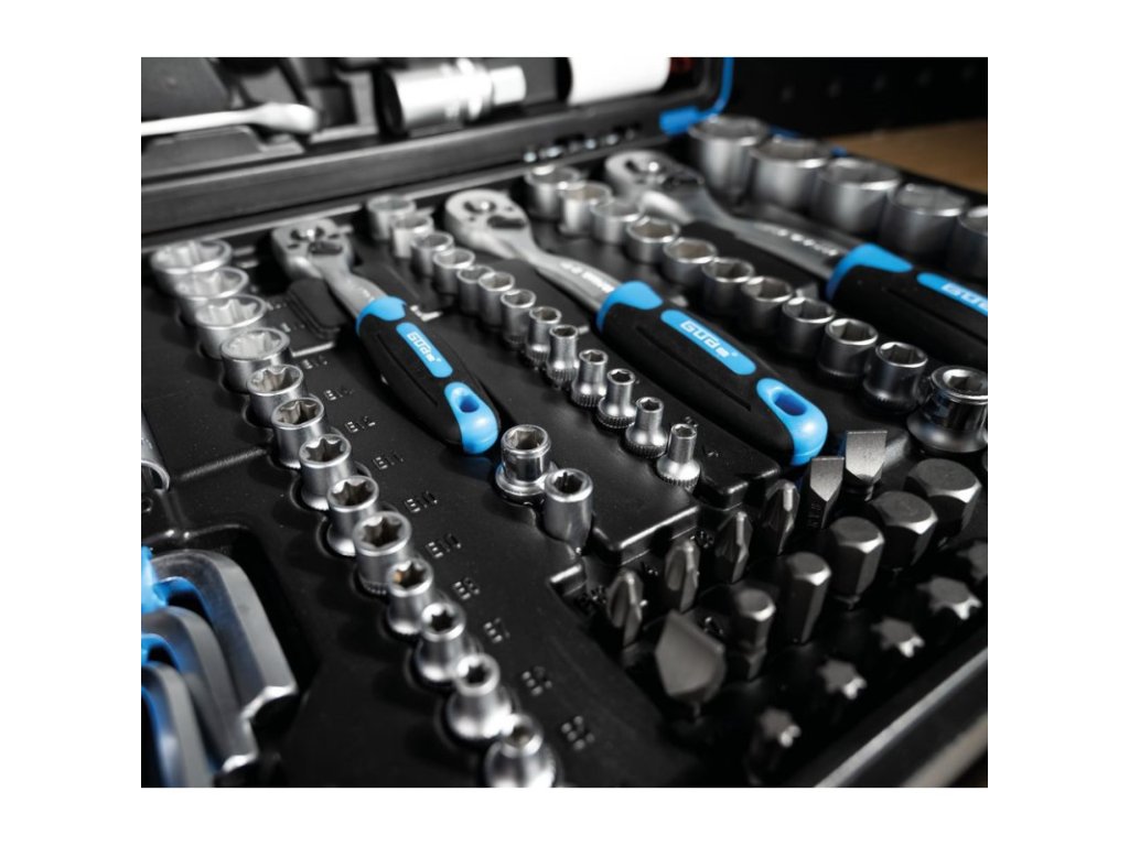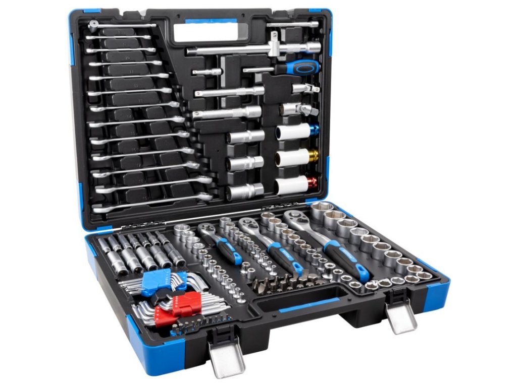 Sada náradia z chróm-vanádiovej ocele obsahuje 3 račne na prepínanie (1/2", 3/8", 1/4"), predĺženia, kardanové kĺby, očko-vidlicové kľúče, inbusové kľúče, nástrčkové kľúče, posuvné T-rukoväte, bitové adaptéry, skrutkovač s račňovou funkciou, súpravy bitov, nástrčkové kľúče na rázový uťahovák.
