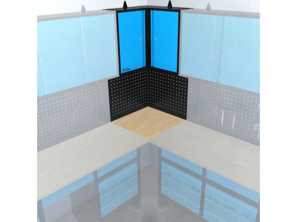 Dvojdielna rohová perforovaná stena je súčasťou dômyselného a veľmi jednoduchého doplnku Eco Line. Vyrobená na mieru umožňuje optimálne využitie rohu miestnosti – predovšetkým v kombinácii so zodpovedajúcou rohovou nástennou skrinkou a rohovou doskou na spojenie dvoch pracovných stolov. Takto jednoducho premeníte často nevyužitý priestor na ďalšiu pracovnú a úložnú plochu. Dve rovnaké perforované steny na presnú rohovú montáž. Oceľový plech s práškovou povrchovou úpravou. Vhodné sú všetky držiaky nástrojov a háčiky pre perforované steny a systémy so štvorcovou perforáciou 10 x 10 / 9 x 9.