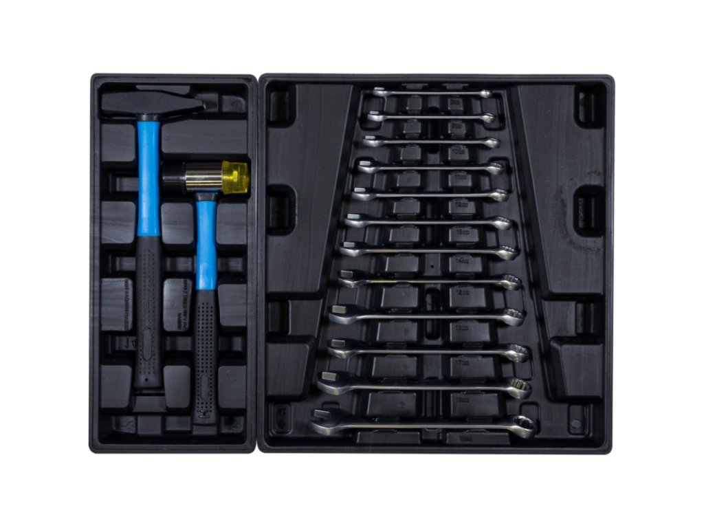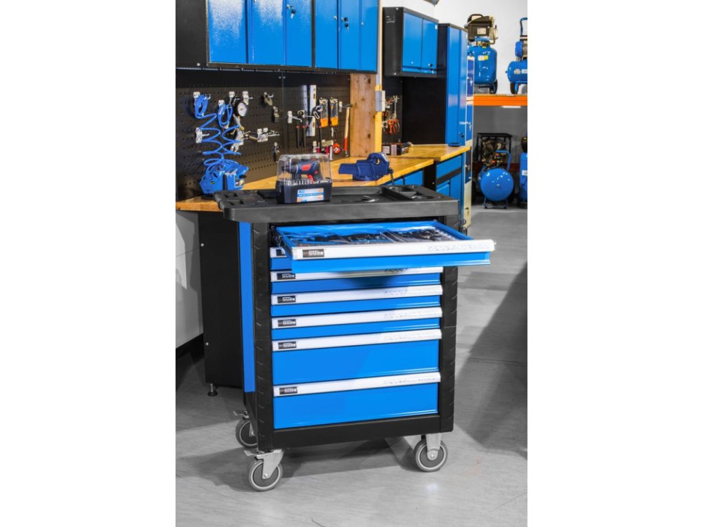 Dielenský vozík s plným výsuvom zásuviek s guľôčkovými ložiskami. Má ergonomickú tlačnú rukoväť a ochranu hrán. Veľký úložný priestor na vrchu a zásuvky na malé súčiastky a náradie uľahčujú prácu. Centrálne zamykanie s 2 kľúčmi a brzdy na dvoch otočných kolieskach. Označenie zásuviek vďaka označovacím políčkam. Perforované bočné steny na oboch stranách na zavesenie háčikov na náradie. Dvojité steny pre väčšiu stabilitu.