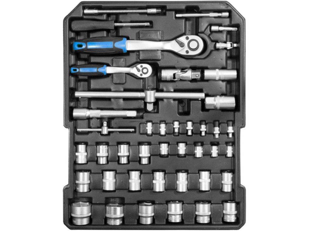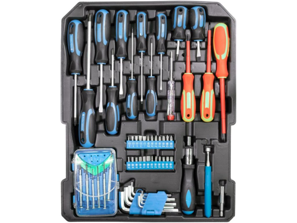V sade sa nachádza základné náradie z chróm-vanádiovej ocele do každej domácnosti či dielne, upevňovacie svorky, kladivo 300 g, trapézový orezávací nôž, krimpovacie kliešte, univerzálne škripcové kliešte, meracie pásmo 5 m, termolepiaca pištoľ, vodováha, izolačná páska, káblové viazače, rôzne klince a skrutky.