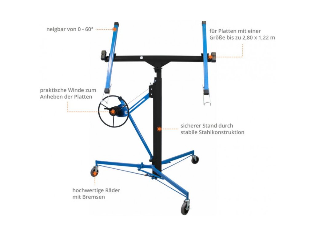 Zdvihák využiteľný predovšetkým pri prestavbách a rekonštrukciách interiéru, napríklad na pridržiavanie sadrokartónových platní, drevotrieskových a drevených dosiek, kovových platní, stropných obkladov a podobne. Kľukový mechanizmus, 3 veľké vodiace kolesá s hladkým chodom a s brzdou, praktické gumené podložky zaisťujú bezpečné držanie panelov.